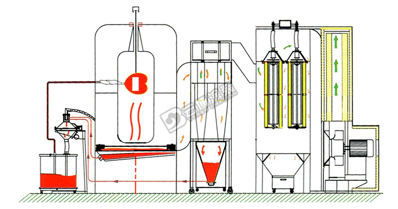 特點(diǎn): 1.適用四種以上顏色粉末噴涂場合; 2.上地面積相對大旋風(fēng)少;